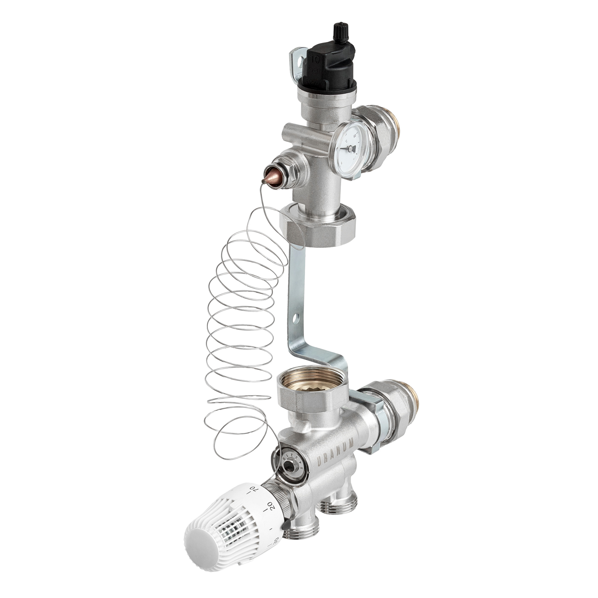 Узел оснащен термостатом с дистанционным датчиком температуры потока, балансировочным вентилем, гидравлическим блоком смешивания потоков.